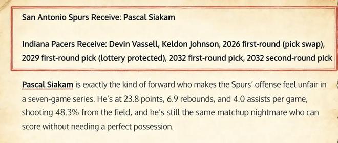 美媒《Fadeaway World》提出瞭一套6換1的交易方案,建議馬刺引入步行者前鋒西亞卡姆。具體方案為——