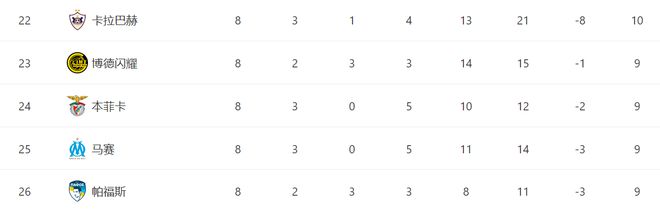 因为4-2的比分,让本菲卡在净胜球上正好超过马赛,升入积分榜第24位,也就是附加赛区的最后一名,最终依靠1个净胜球优势压哨晋级附加赛。