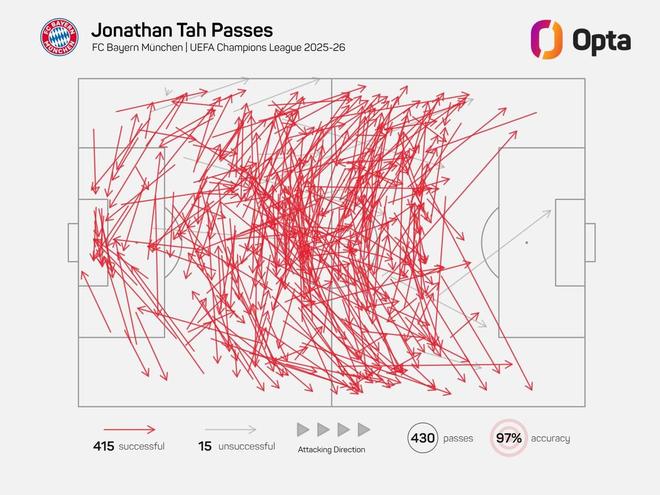 97%,拜仁后卫约纳坦-塔是本赛季欧冠传球成功率最高的球员